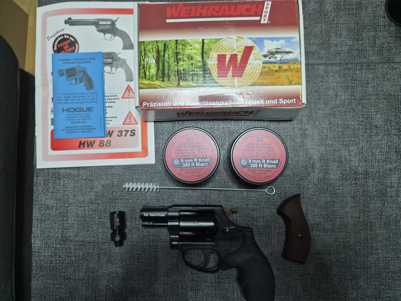 Das SET besteht aus: Revolver HW88, Originalgriff Holz, Hogue Griff zur besseren Führung, Mündungsschoner, Abschussbecher und Reinigungsbürste, 100 Schuss RK Munition, OVP u. Bedienungsanleitung.