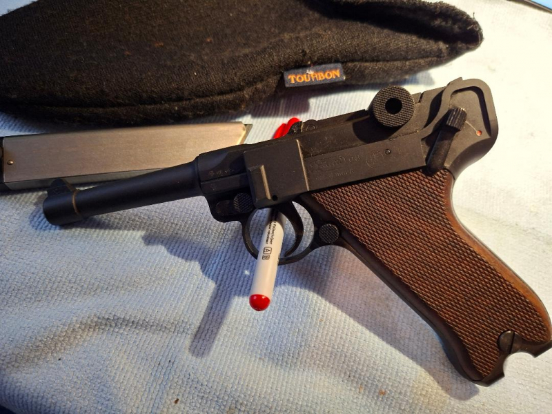 Zur Auktion kommt eine Record 08 Schreckschuss- Pistole In 8mm Knall In neuwertigem Zustand, Brünierung zu 100% vorhanden, Holzgriffschalen, mit dabei ein Pistolenstrumpf von TOURBON, kein weiteres Zubehör vorhanden, Altersnachweis erforderlich, nicht notwendig für ID Mitglieder! Baureihenzulassung für Pistolen / Revolver PTB-Nr.: 517