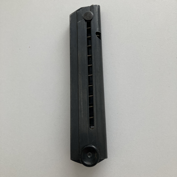 Sie bieten auf ein top erhaltenes Magazin für eine P08 aus der letzten Mauserfertigung mit Kunststoffboden. Abnahmestempel sind 2x Adler 37 oben und unten, FXO als Herstellerstempel und ein hochgestelltes P08 neben dem Magazinknopf. Ein sehr schöner Originalzustand. Bakelitboden unbeschädigt. Die Treppenfeder ist stramm. Eine seltene Gelegenheit ein Magazin in dieser Qualität zu bekommen. Versandkosten beziehen sich auf versicherten Versand innerhalb Deutschland. EU weiter Versand kostet mehr.