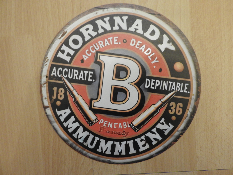 Biete rundes Blech-Werbeschild der Firma Hornady. Das Schild hat einen Durchmesser von 20cm und hat an beiden Seiten eine Bohrung zur Befestigung. Das Schild ist wahrscheinlich im Siebdruckverfahren hergestellt. Herkunft und Alter des Schildes sind mir unbekannt.