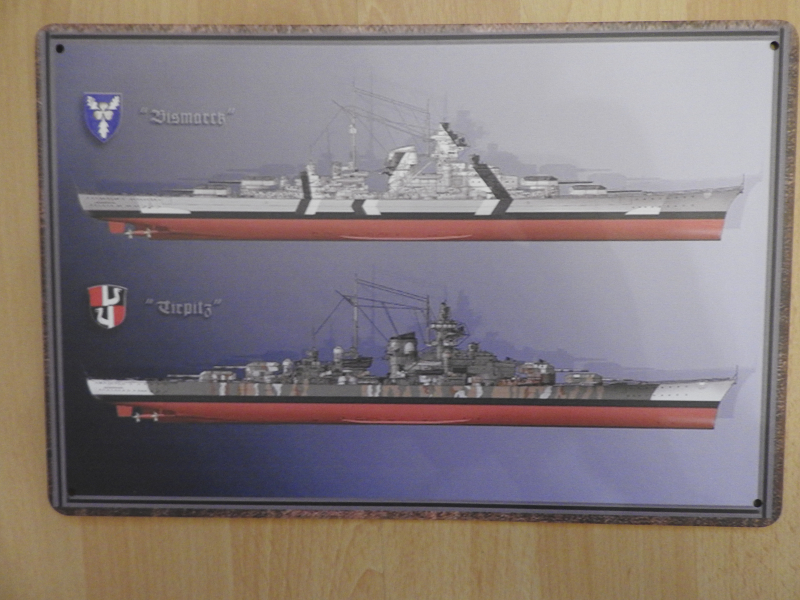 Biete Blech-Dekorationsschild mit Abbildungen der Schlachtschiffer Bismarck und Tirpitz. Beide Schiffe sind in den Tarnungen des Jahres 1941 abgebildet. Das Schild ist 20 cm x 30 cm groß und hat an allen vier Ecken Bohrungen zur Befestigung. Das Schild wurde wahrscheinlich im Siebdruckverfahren hergestellt. Herkunft und Alter sind mir unbekannt.