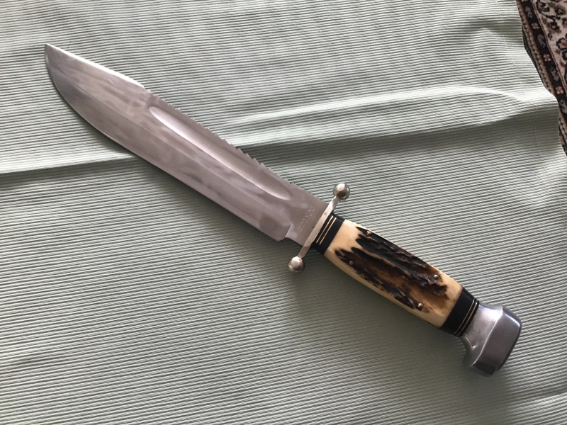 Bowiemesser Anton Wingen „Otnello“ Klingenlänge 21cm, 5mm Stärke mit Sägerücken, Hirschhorn Griffschalen, mit Scheide! Leichte Gebrauchsspuren