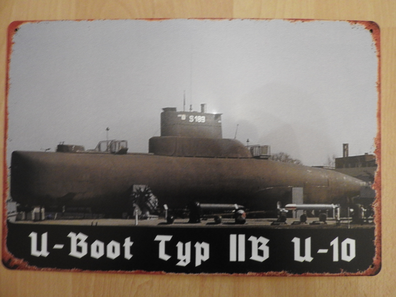 Biete ein Blech-Dekorationsschild mit Abbildung eine U-Bot Typ IIB, U-10. Das Boot stammt aus dem Mitte der 30er Jahre. Zue Herkunft und dem Alter des Schildes kann ich keine Angaben machen. Das Schild hat an allen vier Ecken Bohrungen zur Befestigung und wurde wahrscheinlich im Siebdruckverfahren hergestellt.