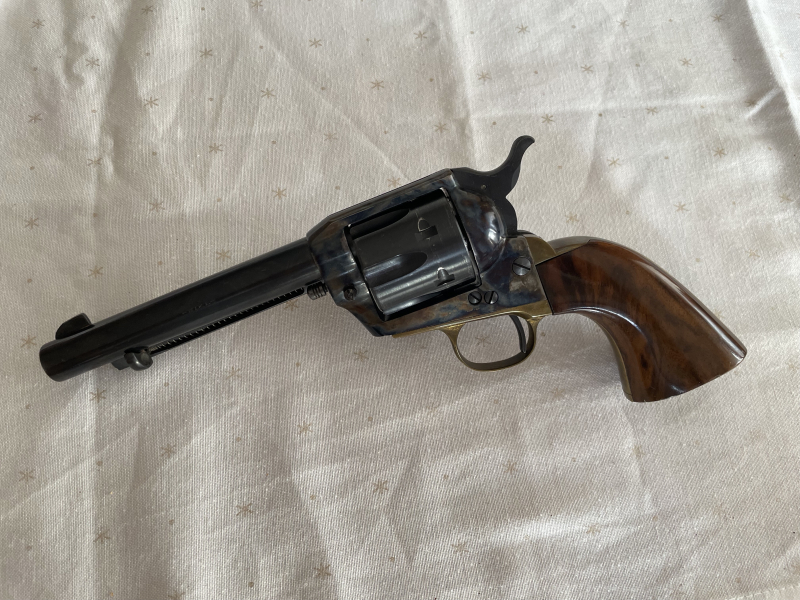 Zum Verkauf im Auftrag kommt ein WIKE Revolver Kal. 4mm mit der PTB 17. es ist ein Nachbau eines SAA Revolvers mit einem Stahlrahmen, der buntgehärtet ist und einem Griff aus Messing. Die Brünierung am Lauf und Trommel ist sehr schön und nicht abgegriffen. Auf der Trommel befinden sich die üblichen Spuren des Gebrauchs. Das Holz am Griff sieht in seinem Hochglanz-Finish sehr schön aus und weist nahezu keine Auffälligkeiten auf. Bis auf ein leichtes Spiel der Trommel, wie auch bei vielen 357ern, konnte ich im Trockentest keine technischen Auffälligkeiten feststellen. Die letzten zwölf Jahre hat die Waffe im Tresor verbracht. Ich hoffe, die Bilder geben den Zustand recht gut wieder. Der Verkauf erfolgt nur an Erwerbsberechtigte (z. B. WBK Grün, Sammler WBK oder Handelslizenz). Der Verkauf erfolgt von privat, ohne Gewährleistung, Garantie, Umtauschrecht oder Ähnliches. Nachverhandlungen sind ausgeschlossen. Abholung vor Ort ist nach Vereinbarung möglich. Der Versand erfolgt nach Überprüfung der Unterlagen durch die Behörde. Kein Export ins Ausland! Bei den Versandkosten handelt es sich um eine Mindest-Pauschale. Sollten Sie (Käufer) spezielle Wünsche zum Versand/Empfang der Ware haben, können sich die Versandkosten ändern, was nachträglich zu verrechnen ist.