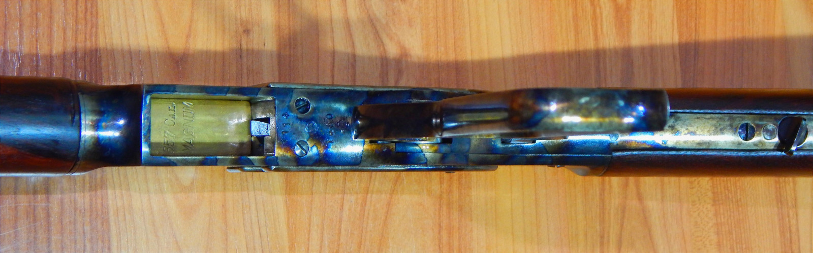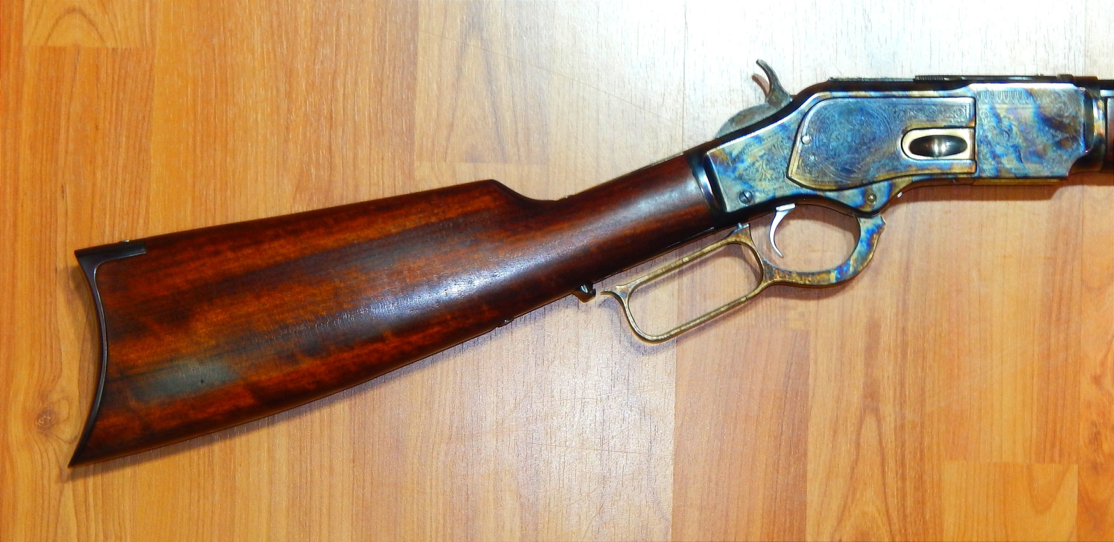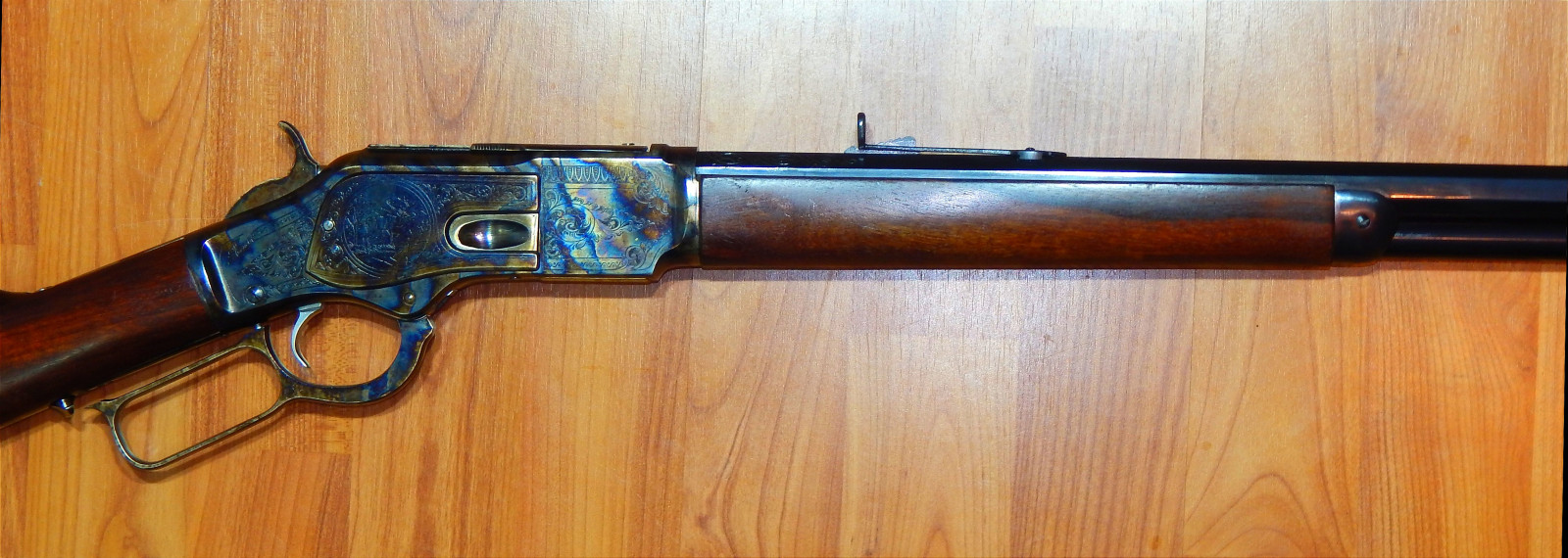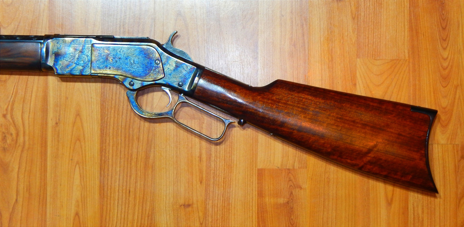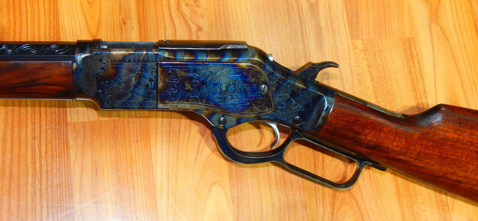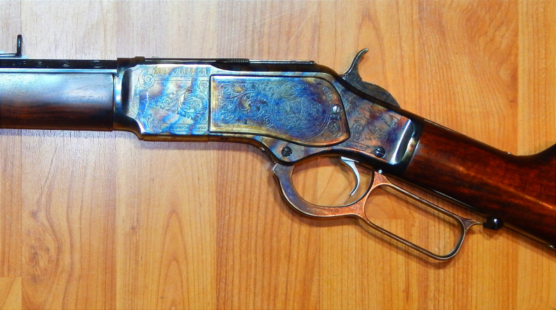 Der Empfänger mit Staubschutzkappe mit vollständiger Härtungsfarbe, graviert im Winchester-Werksstil mit auffälligen Blattwerkverzierungen, auf der rechten Seite mit einer Vignette eines röhrenden Hirsches in natürlicher Umgebung, auf der linken Seite mit einer Vignette eines Bisons in natürlicher Umgebung, Hammer, Hebel und Abzug mit vollständiger Härtungsfarbe, Schaft mit brünierter Halbmond-Schaftkappe, Vorderschaft mit brünierter Kappe, der achteckige Lauf ist mit „Armi San Paolo-Brescia-Italy” graviert, mit gravierten Mustern an Mündung und Verschlussende, durchgehendes Magazinrohr, Sportvisier und Buckhorn-Kimme mit verstellbarem Mitteleinsatz.