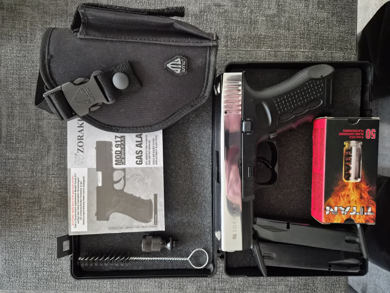 Ich biete ein neues Spezialset bestehend aus: Zoraki 917 im "glänzenden Chrom" mit schwarzem Griff (wird seit Jahren nicht mehr produziert), -2- Magazine, Pistolenholster von UTG mit Magazintasche, 50 Schuss PAK, Original Koffer mit Bedienungsanleitung, Abschussbecher und Reinigungsbürste.