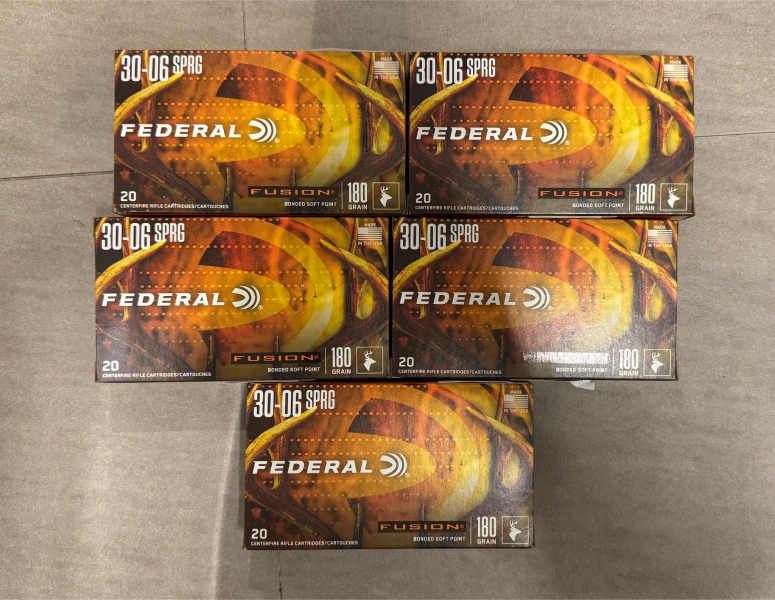 Zum Verkauf stehen insgesamt 5 Packungen Federal Fusion Jagdmunition im Kaliber .30-06 Springfield mit 180 Grains Geschossgewicht.