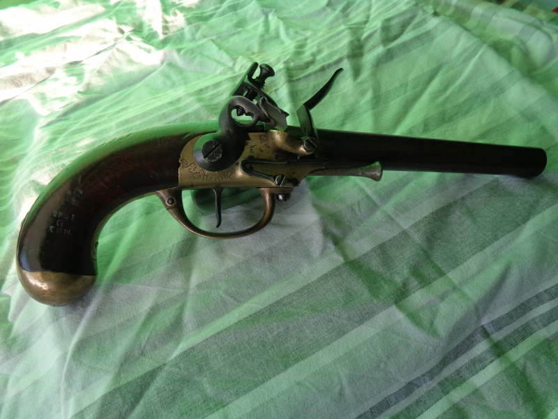 Laufoberseite mit 83 für Ausgabe und B In allen Teilen original erhaltenes Stück, nichts verputzt, schöne Patina auf Lauf und Metall, Griffholz sehr gut und noch in der alten Fassung. Auf dem Schlosskasten ein bekröntes L für Lampert, dieser in St. Etienne tätig von 1777 - 1784, das B auf Lauf und Griffstück für Joseph Bertheas 1777 - 1785, die offene Krone für St. Etienne Seltenes sehr schönes Stück.