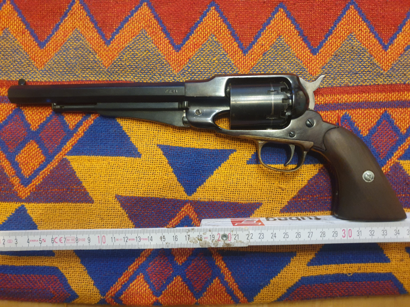 Verkaufe einen gebrauchten Vorderlader Revolver Modell Remington 1858mit Perkussionszündung im Kaliber. 44! Der Zustand der Waffe ist gebraucht, hergestellt in Italien mit gültigen Beschuss. Funktion ist gegeben, Schloß rastet ein und hält, wird bei betätigen des Abzug ausgelöst. Lauf ist beschriftet mit "NAVY ARMS CO. RIDGEFIELD N.J.-ITALY". Privatverkauf, keine Garantie oder Rücknahme/Gewährleistung, Verkauf nur an EWB. Portokosten sind eine ungefähre Angabe, verrechnet werden nur die tatsächlich anfallenden Kosten.