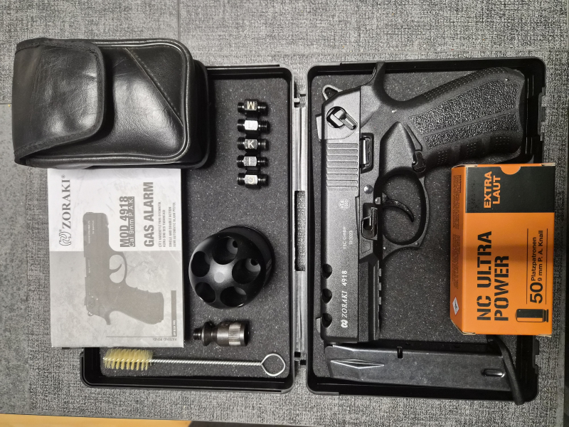 Ich biete ein neues Spezialset bestehend aus: Zoraki 4918 in Schwarz mit schwarzem Griff (wird seit Jahren nicht mehr produziert), -1- Magazin, Pyro- Launcher Umarex für 5 Geschosse im .15mm gleichzeitig abfeuern - mit 5 verschiedenen Gewindeaufsätzen und Ledertasche zur Aufbewahrung, 50 Schuss PAK, Original Koffer mit Bedienungsanleitung, Abschussbecher und Reinigungsbürste.