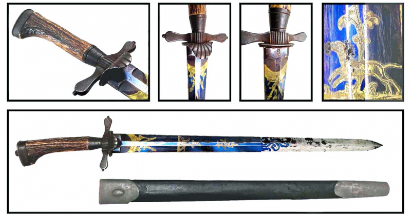 Hirschfänger mit gebläuter und vergoldeter Klinge aus der Mitte des 19. Jahrhunderts. Brüniertes Eisen-Kreuzgefäss mit vollem Hirschhorn-Griff. Sechskantklinge mit Königskopf-Marke der Gebrüder Weyersberg, Solingen 1787 - 1883. Händlerbeschriftung von "G.H.Kohl Waffenfabricant in Stuttgart" (Schwertfeger von 1831 - 1850). Die gebläute und vergoldete Klinge geätzt mit militärischen und jagdlichen Motiven. Dazugehörige, schwarz belederte Holzscheide mit brünierten Eisenbeschlägen, gestempelt "KOHL".