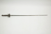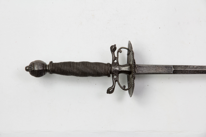 Degen, deutsch/sächsisch, um 1700, verziertes Eisengefäß mit Parierstangen und Stichblatt, auf Stichblatt aufgelegte, diamantartige, geschliffene Verzierungen, Griffstück mit Eisendrahtwicklung und Türkenbunden, runder, kantiger Abschlussknauf, zweischneidig auslaufende Klinge, noch typische Rapierform mit kantiger Fehlschärfe , Reste von Ätzungen im ersten Drittel, halbes Wagenrad mit zwei "Z", darüber sächsisches Wappen mit Kurhut, Palmwedeln und Ornamenten, früher, eleganter und leichter Degen, teilweise stark oxidiert, selten, Gebrauchsspuren. L 102 cm.