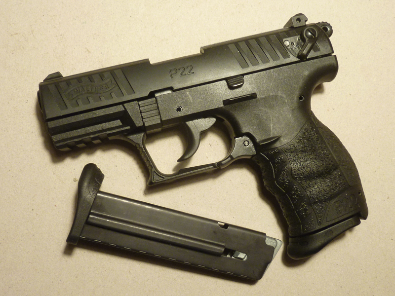 Sehr schöne von Walther gebaute Lizenzanfertigung der P 22 als Knall/Gas-Pistole mit 2. Magazin.