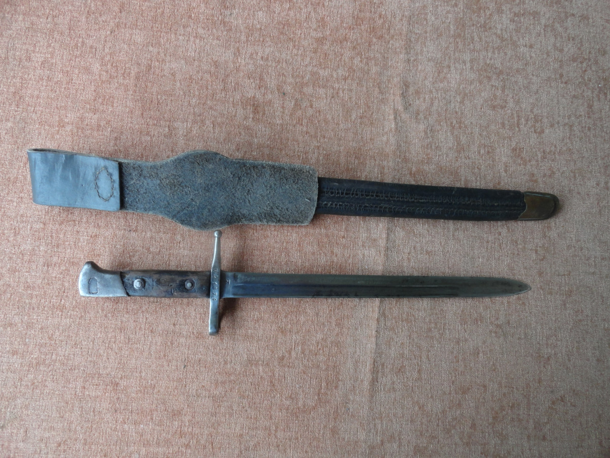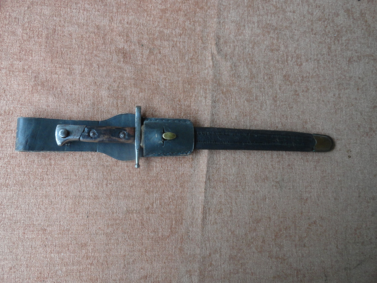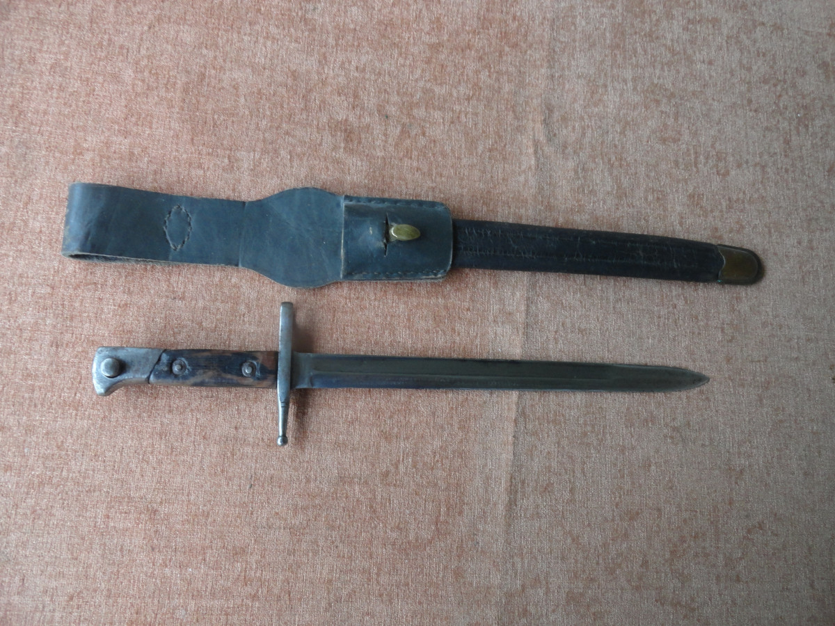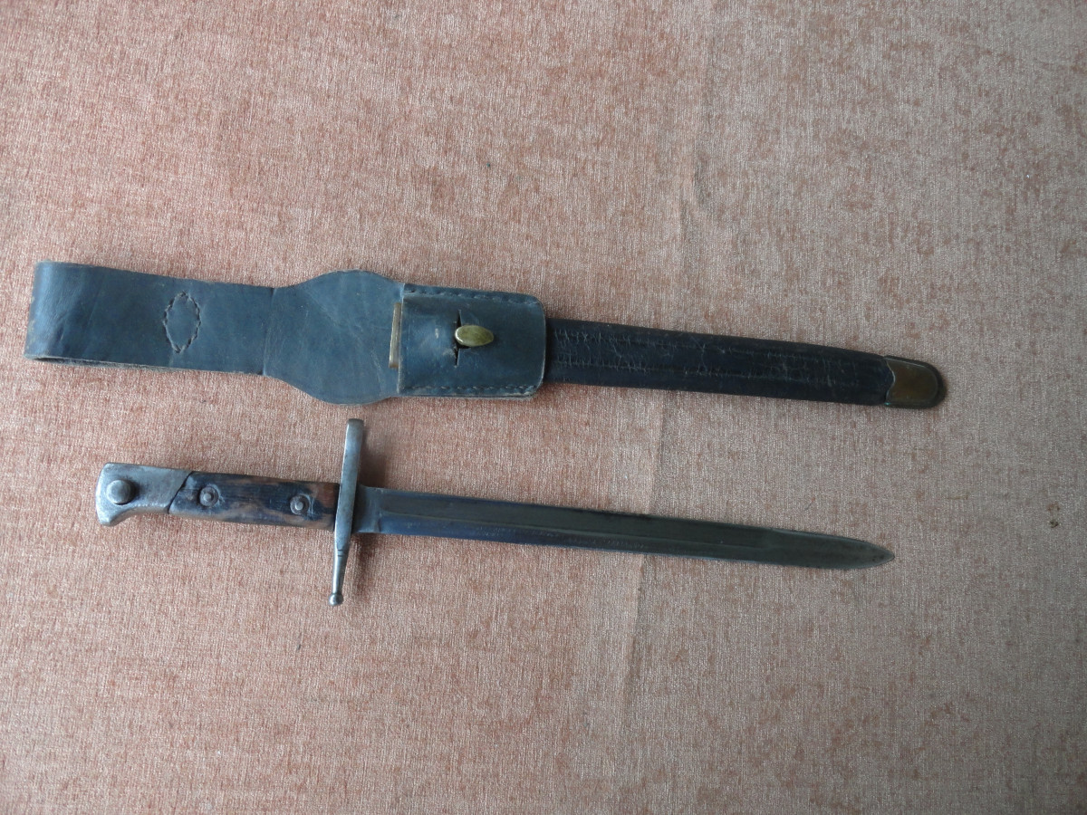 Bajonett für Carcano Karabiner 1891 mit Tragetasche. Das Bajonett mit normalen alters und Gebrauchsspuren die Griffschalen mit kleineren Fehlstellen. Auf der Klinge und Parierstange verschiedene Stempel siehe auch Bilder. Lederscheide mit Messingbeschlägen Naht nicht offen.