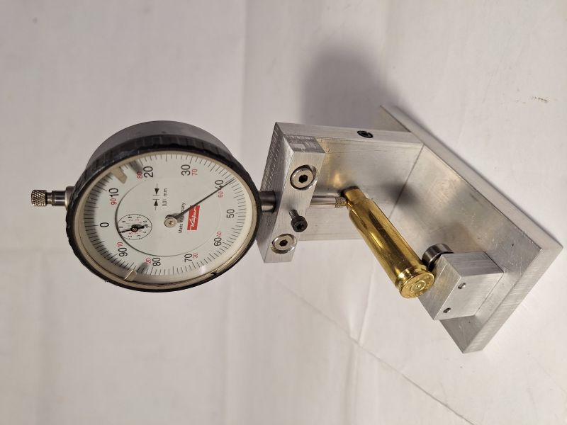 mit einer Messuhr Käfer 0,01 / Dorn Ø 6,5 mm ( es passen alle Einsätze von Lyman )
