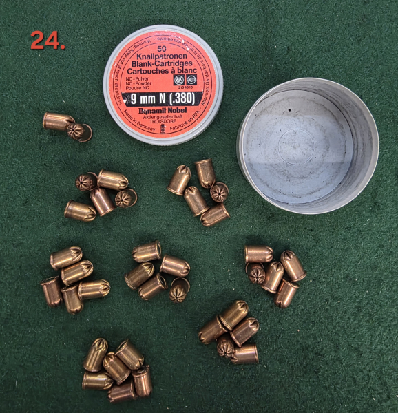 24.) RWS Dynamit Nobel Kartuschen Konvolut Platzpatronen .380 9mm RK SRS Schreckschuss