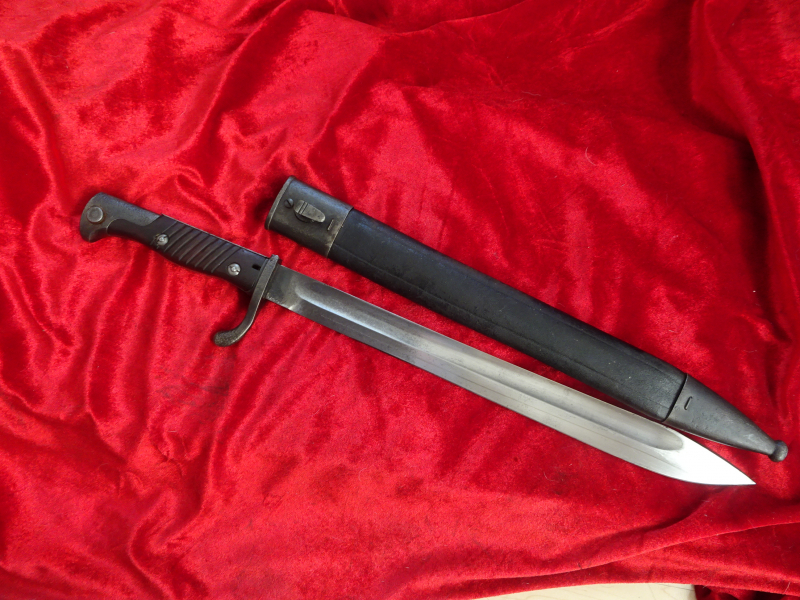 Sie bieten hier auf ein altes originales Bajonett 98/05 deutsch kplt. mit Lederscheide, Hersteller Haenel, Suhl, Klinge noch sehr gut erhalten (nicht geschliffen und keine Scharten), Gefäss und Scheidenbeschläge etwas narbig, div. Abnahmestempel, Bajonett lässt sich ca. einen halben Milimeter nicht in die Scheide stecken (siehe Foto), evtl. Lederscheide etwas geschrumpft oder es befindet sich etwas in der Scheide, für das Alter noch gut erhalten, Drücker funktioniert, garantiert alt und original, darauf gewähre ich uneingeschränktes Rückgaberecht, ebenso bei falscher Beschreibung, ansonsten da Privatverkauf keine Gewährsübernahme!