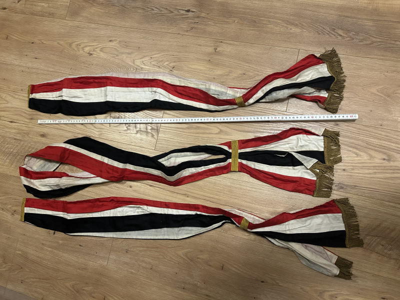 3 Schärpen schwarz weiß rot original aus der Zeit vor dem 2Wk oder Sogar vor dem 1WK. Ich kann nicht viel darüber sagen Original Zustand nicht gereinigt so belassen wie damals erworben. Trenne mich aus Sammlungsauslösungsgründen davon. Länge ca 100cm. Macht sich gut neben einer Fahne aus dieser Zeit.