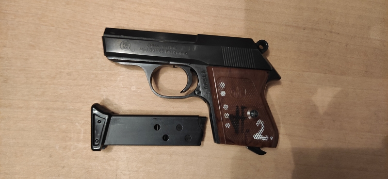 "Kapazität 5 +1 Schuss, Fertigung von 1976 bis 1994, Inspiration Walther TP, frühe Serie mit 5-stelliger Seriennummer [hier angeboten: 07608], Auslieferung 1977 für den Bereich 006771 bis 015220."