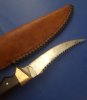 Messer hat eine schöne Skinner Form, mit eine Sägemuster oberhalb. Messergriff ist aus dunklem schweren Edelholz.