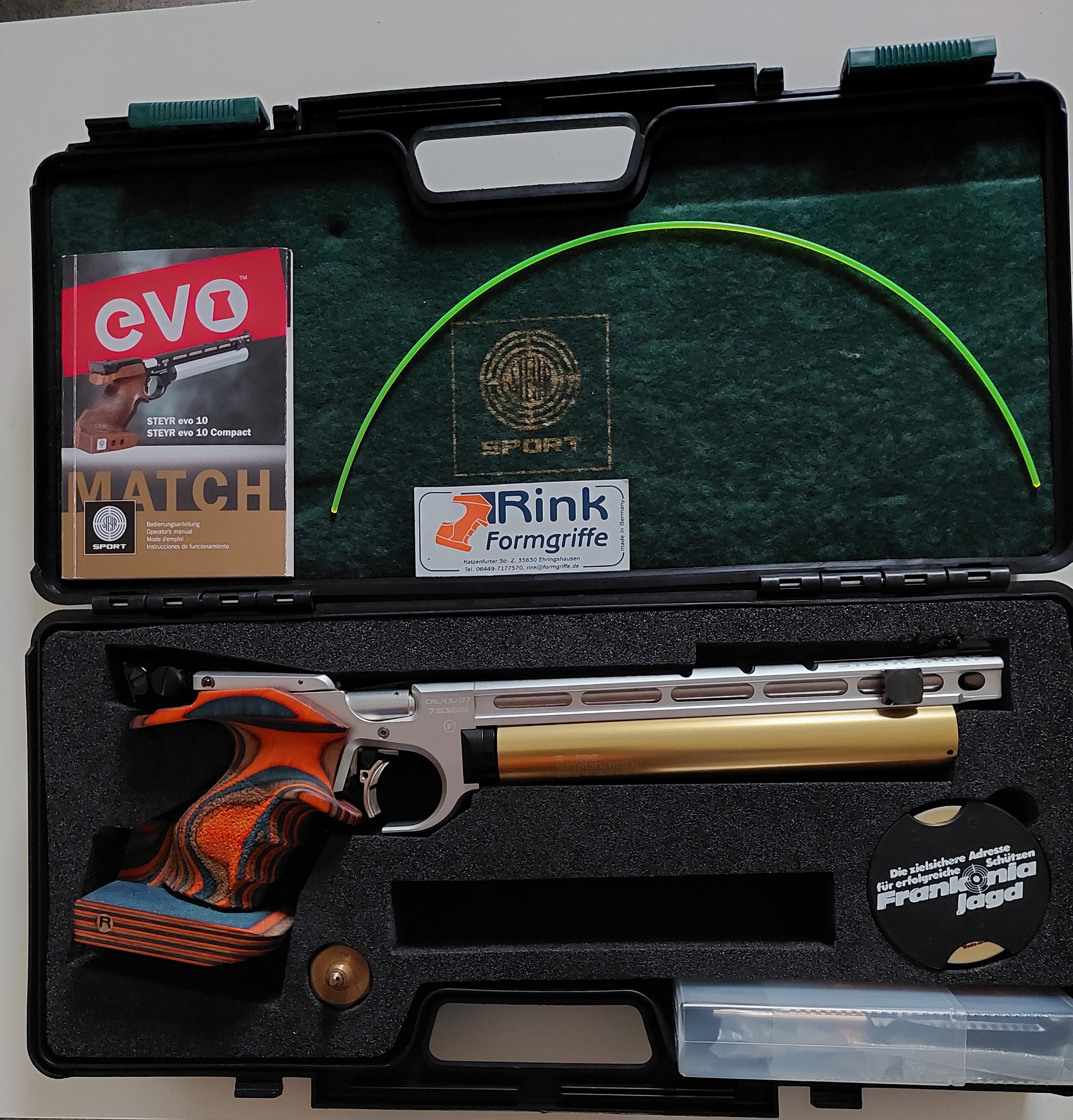 Ich verkaufe eine Luftpistole der Marke STEYER evo 10 in silber mit mechanischem Abzug. Die LP habe ich 2018gekauft.Ein Druckluftbehälter in Gold verwendbar bis 05/2028 wird mitgeliefert. Die LP ist in einem technisch einwandfreien Zustand. An der LP ist ein Ring Schichtholz Griff der Größe MRBO montiert.