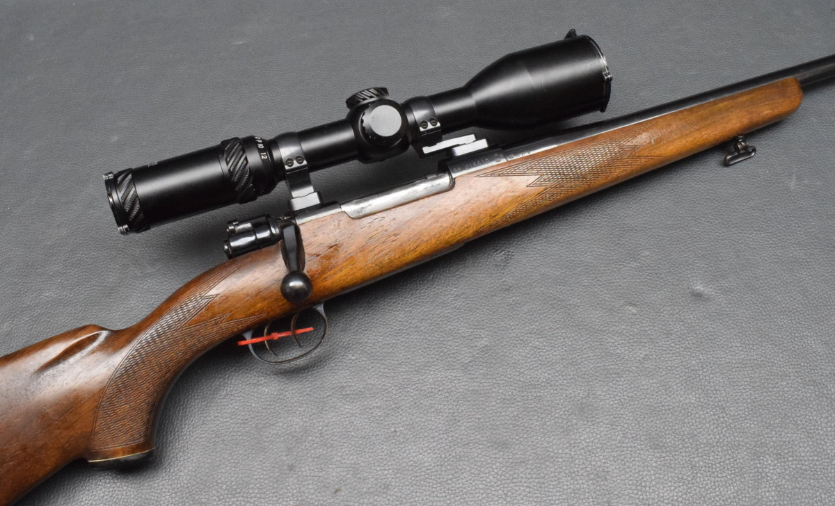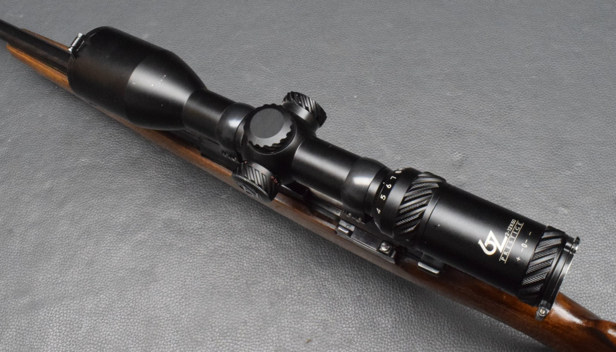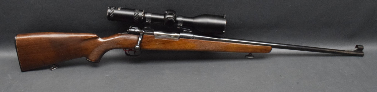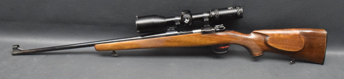 gebogener Kammerstängel, Stecher, 4-Schuß Magazinkasten. Montiert mit Zielfernrohr Optisan 2-12x50 Abs. 4 LP rot/grün, 30mm Ringen. Nußbaumschaft mit Backe, Schaftkappe & Riemenbügeln.