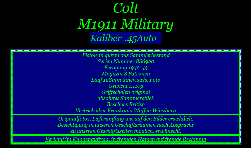 Artikel-ID: 20186106  •  ArtikelNr. des Verkäufers: 12391  •  Kategorie: Sammlerwaffen/-munition > Kurzwaffen > 1900 - 1945