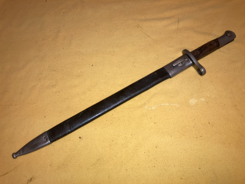 Hier versteigere / verkaufe ich ein Bajonett Artilleria aus Spanien ( Modell M1893 ) in der Lederscheide mit durchgehender Blutrille, es kam zum Einsatz auf einem Mausergewehr 1909. Auf der einen Seite der klinge ist eine Krone unter dem Schrifzug "Artilleria" abgebildet, siehe Bild. Desweiteren FCA N.......- leider nicht zu lesen. Auf der Rückseite sind Nummern eingeschlagen, sind aber nicht identisch mit der Nummer auf der Lederscheide. Das Bajonett ist in einem guten Zustand - 2+. Gesamtlänge mit Scheide ca. 54,5 cm, Klinge ca. 40 cm, Griff ca. 12,5 cm. Privatverkauf. Versand innerhalb Deutschland. Altersnachweis erforderlich.