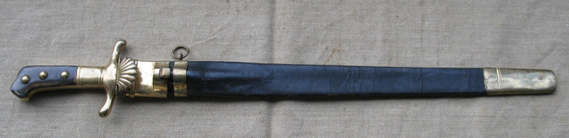 Mächtiger Hirschfänger oder Hauer, Klinge beidseitig mit Monogramm MJ(MJK) und Krone, Gefäß in Messing mit Hornauflagen. Lederscheide mit Messingbeschlägen oberer Signiert mit Strobelberger. Vorderseitig mit Einlass für ein kleiner Beimesser, dieses leider fehlend. Rückseitige Scheidennaht geschlossen.