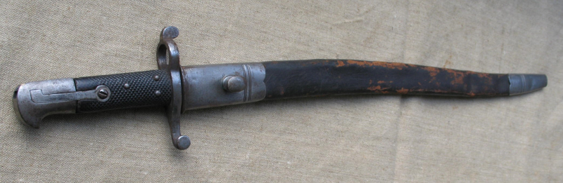 Englisches Yataghan Bajonett M 1856 1. Modell (Griffrücken mit Laufrundung), schöner Arsenalzustand, Lederscheide mit Eisenbeschlägen, rückseitige Scheidennaht geschlossen.