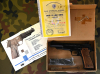 Diese Pistole lag über 50 Jahre nur unberührt und gut geölt in der nummerngleichen, leicht vergilbten, angestaubten Originalschachtel, mit vergilbter originaler Kurzbeschreibung mit Explosionszeichnung, Imbusschlüssel und Beschussbescheinigung der IHK Paris, gesiegelt vom Beschussamt.