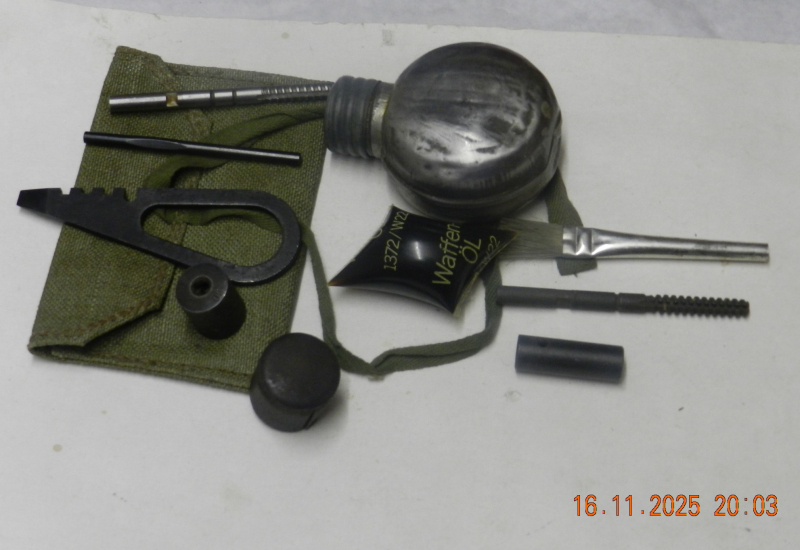 Putzzeug, Ölflasche, gefülltes Ölkissen und Werkzeug für Militärkarabiner.