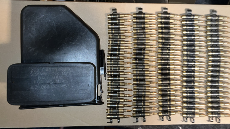 Biete hier Sofortkauf ein Komplettset "MG4 M249 SAW FN Ammo Box mit 100 x Dekomunition Messing 5.56 223 auf Zerfallgurt Stahl".