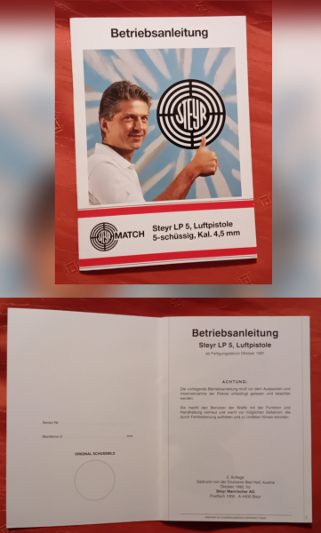 Bedienungsanleitung / Betriebsanleitung für eine Steyr LP 5 Luftpistole 5-schüssig, 24 Seiten. Der Verkauf erfolgt nur gegen Vorkasse oder Abholung bei Barzahlung. Versand versichert in Deutschland 8,- Euro ins EU - Ausland 18,- Euro