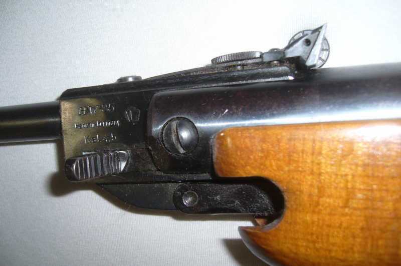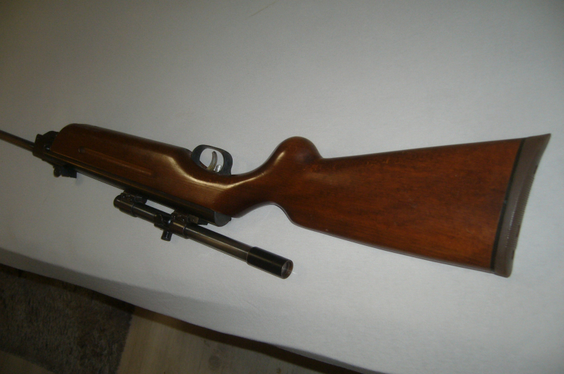Luftgewehr Weirauch HW 35 F mit WEKU 4 Zielfernrohr, Schaft guter Zustand, Brünierung abgegriffen, ohne Sicherung, Kimme vorhanden, Korn fehlt, leider läßt es sicht mehr spannen vielleicht Feder Defekt.Nummer hinten ist 600091.