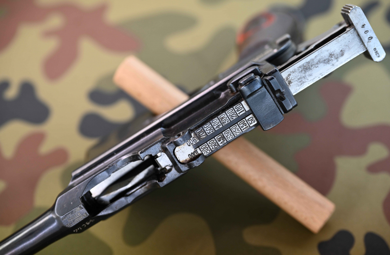 Optisch rundum schöner, homogener, vor längerer Zeit vermutlich einmal überarbeiteter Gesamteindruck, tiefmattschwarzes Finish rundum prima, nur am Visiersockel und am Patronenlager sind außen ganz leichte, nicht fühlbare Spuren von früheren feinen Flugrostsprenkeln sichtbar, was auf die erfolgte Überarbeitung hindeutet.