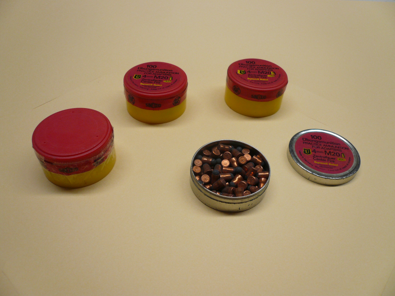 Vorab!! Kein Verkauf ins Ausland!! Zum Erwerb stehen 4 Packungen mit ca. 100 Stück pro Dose Munition im Kaliber 4mm M20 von Dynamit Nobel zur Verfügung. EWB erforderlich!! Keine Garantie oder Rücknahme da Privatverkauf! Versandkosten können variieren!