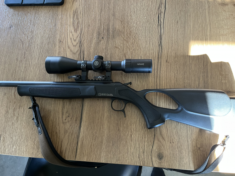 Die Lauflänge beträgt 42cm, auf der Waffe montiert ist ein Hawke Zielfernrohr