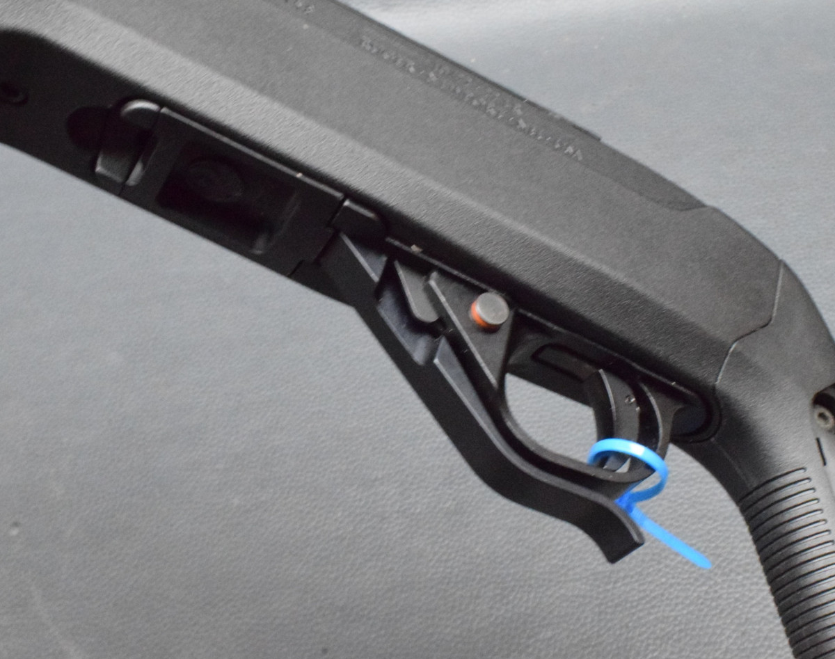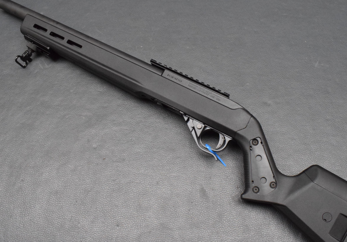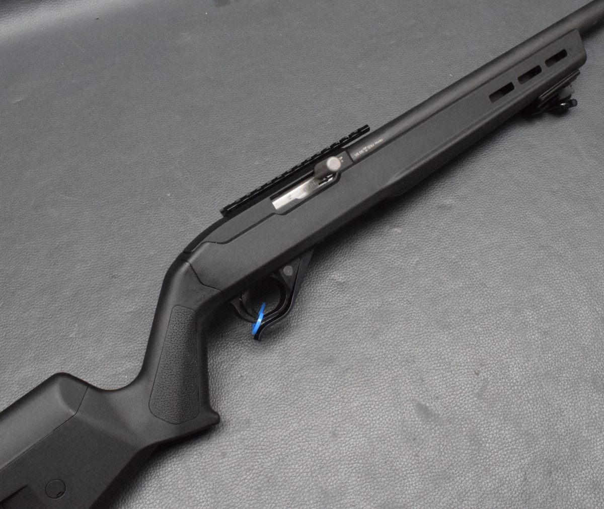 Erweiterter Magazinrelease von Timney entworfen, Knopfsicherung am Abzugsbügel, Montiert mit Picatinny-Schiene.