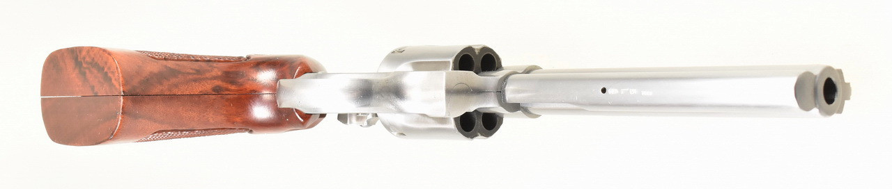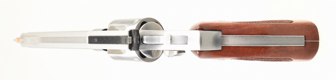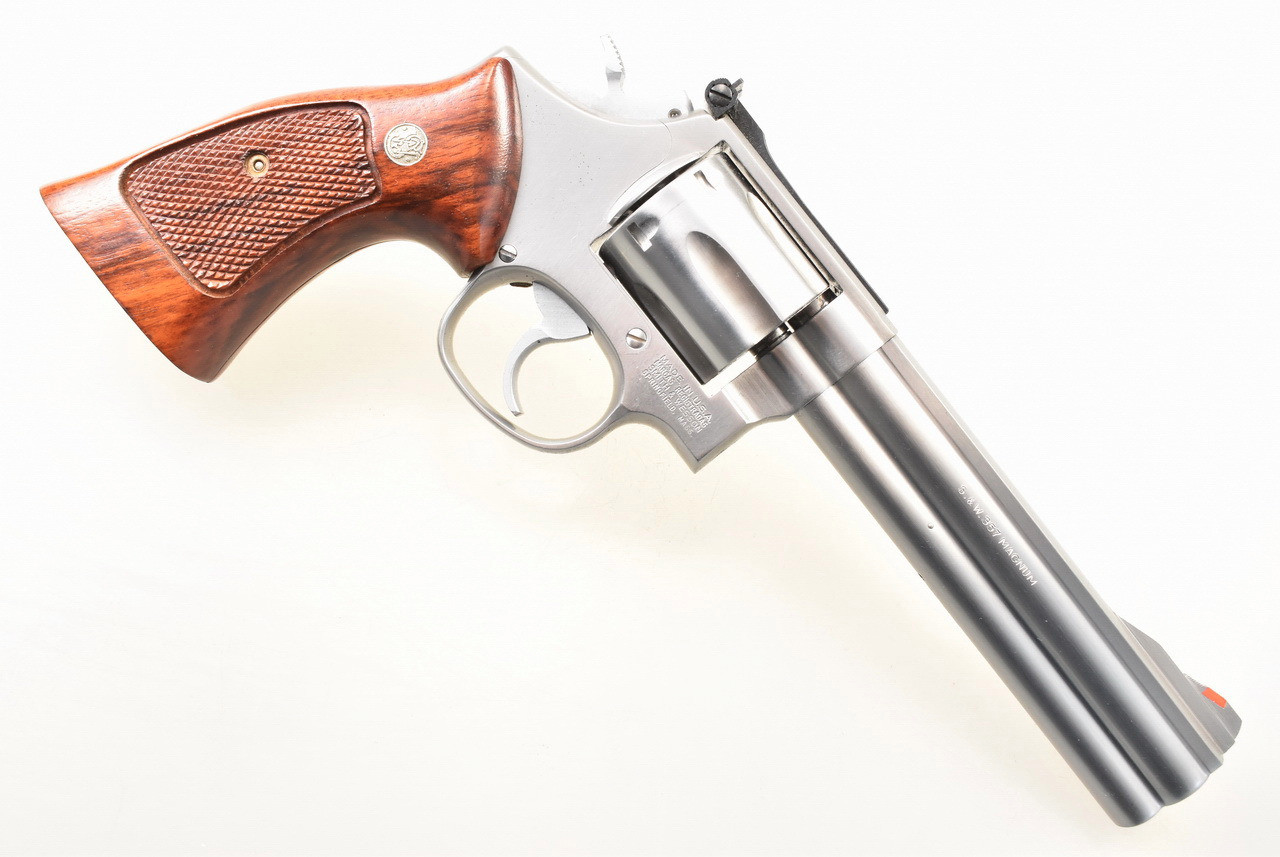 Gebrauchter Stainless - Steel Double Action Revolver Modell 686 - 3 des bekannten amerikanischen Herstellers Smith & Wesson. Spiegelblanker Lauf. Belgischer Beschuß. AKAH Vertriebsstempel. Höhen- und seitenverstellbare Visierung mit White Outline Kimmenblatt. Rampenkorn mit roter Kunststoffeinlage. 187mm lange Visierlinie. Originale S&W Holzgriffschalen mit Fischhautmuster. Details siehe Bilder.