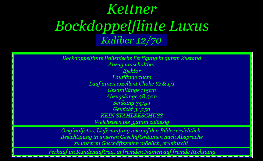 Artikel-ID: 20187087  •  ArtikelNr. des Verkäufers: 12102  •  Kategorie: Jagdwaffen > Flinten > Bockflinten