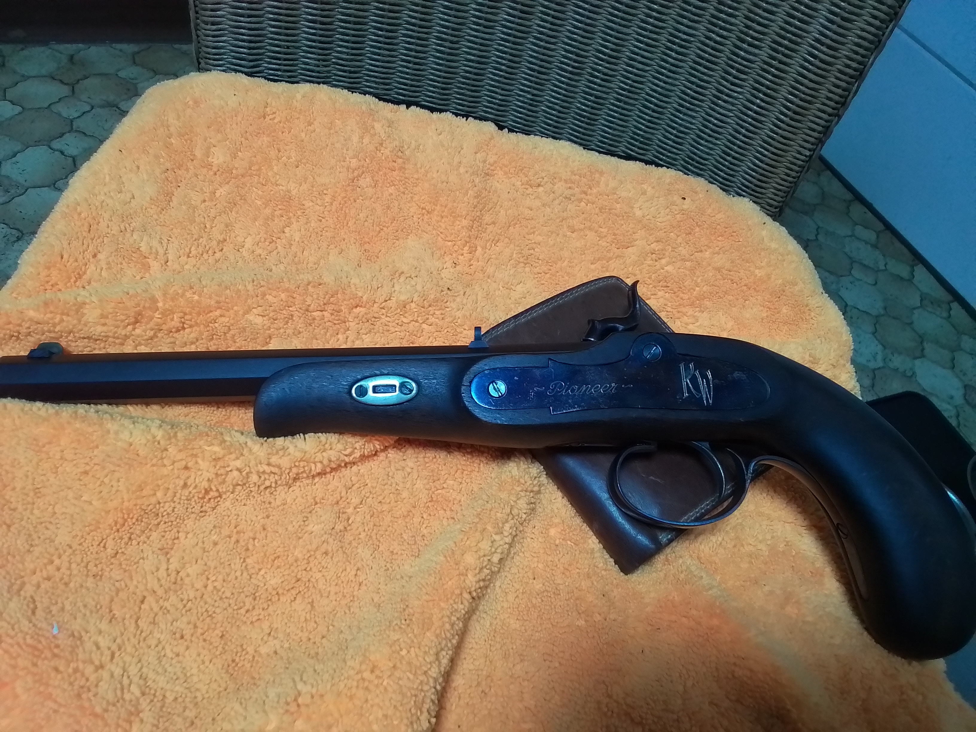 Hallo. Biete hier diese.Pistole im Kaliber .45, Black Powder only , an. Ich verkaufe sie für die Witwe eines Bekannten an die keine Verwendung dafür hat an.Auf der linken Seite vom der Schlossplatte wurden mal die Initialen K und W eingraviert. Ist bestimmt möglich das wegzu schleifen und dann zu polieren,aber das überlasse ich dem neuen Besitzer. Wenn Sie ein Vitrinenstück wird kann man sie so platzieren das man es nicht sieht. Vielleicht passen ja auch die Initialen.Wie sie ausschaut wurde sie wenig geschossen und gut gepflegt. Hahn rastet in beiden Stellungen ein,Lauf und Piston sind durchgängig und der Piston scheint noch neu zu sein.Da es sich um einen Privatverkauf handelt gibt es keine Garantie oder Rücknahme Option. Pistole ist noch frei ab 18 Jahren. Viel Spaß bei der Auktion.