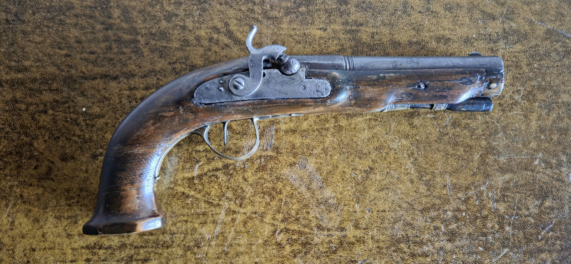 Leichte Antike Perkussions Vorderlader-Pistole, Achtkantlauf geht in runden Lauf über, gekennzeichnet mit J.M.D., Lauf ca. 15cm, Durchmesser ca. 12,5mm