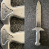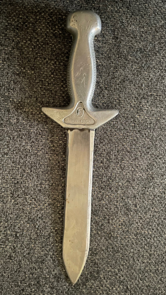 Zur Auktion ein altes Tauchermesser Mod. ''Pirat'' Made in Ungarn. Zum Einsatz kam es bei der GST und NVA. Zustand siehe Foto. Gesamtlänge 29,5 cm, Klinge 17 cm. KLinge wurde scheinbar mal beschliffen. Privatverkauf ohne Garantie und Rücknahme.