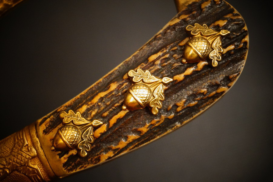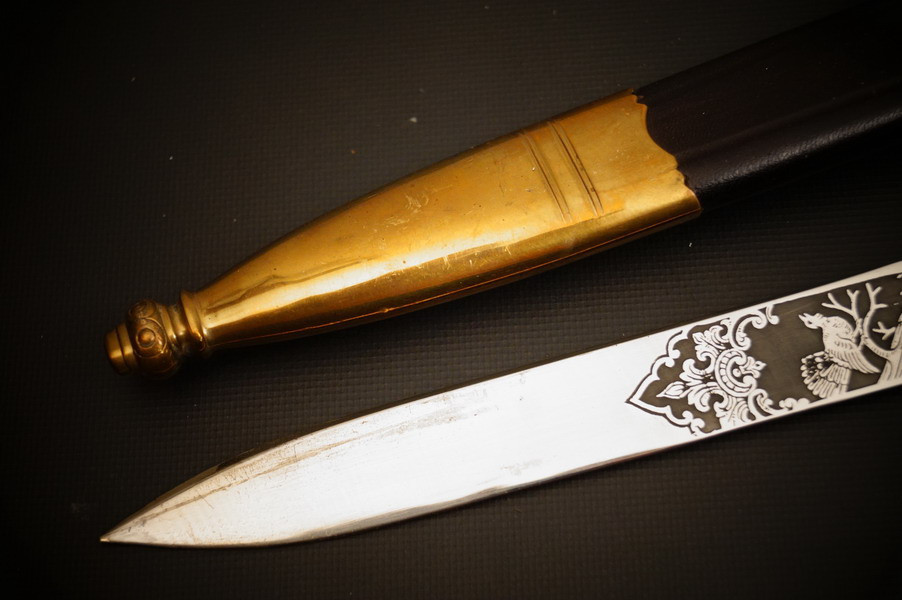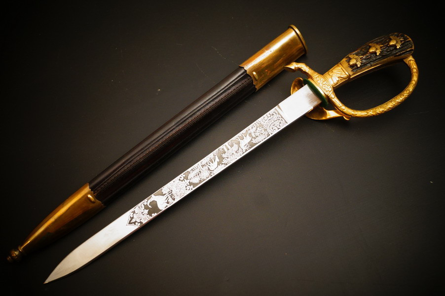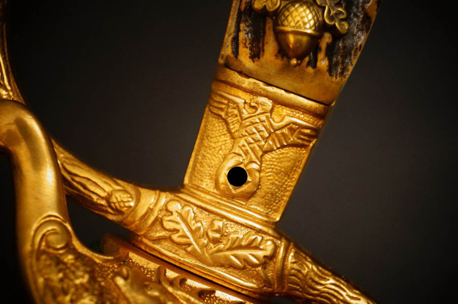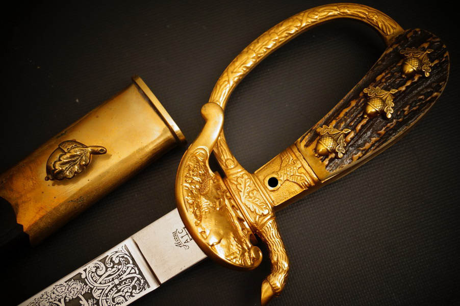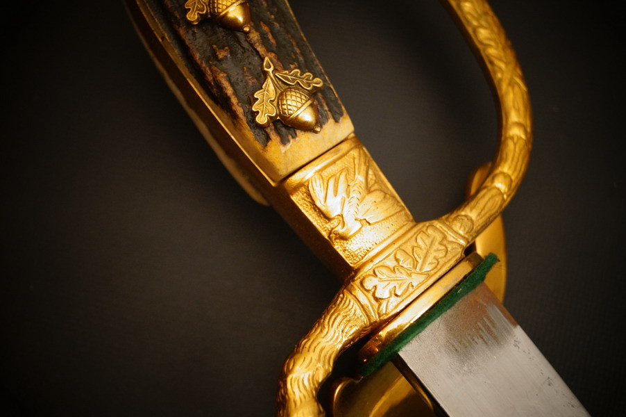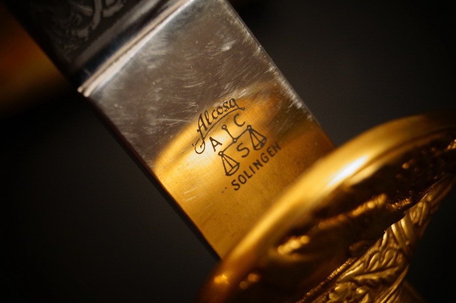 Fundzustand. Bestzustand ! Klinge mit dreifacher Ätzung und Hersteller Alcoso Solingen - Alfred Coppel Solingen. Echthorngriffschalen und sehr gute Vergoldung. WK2