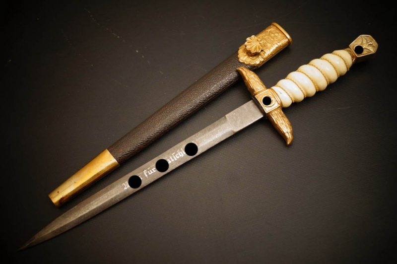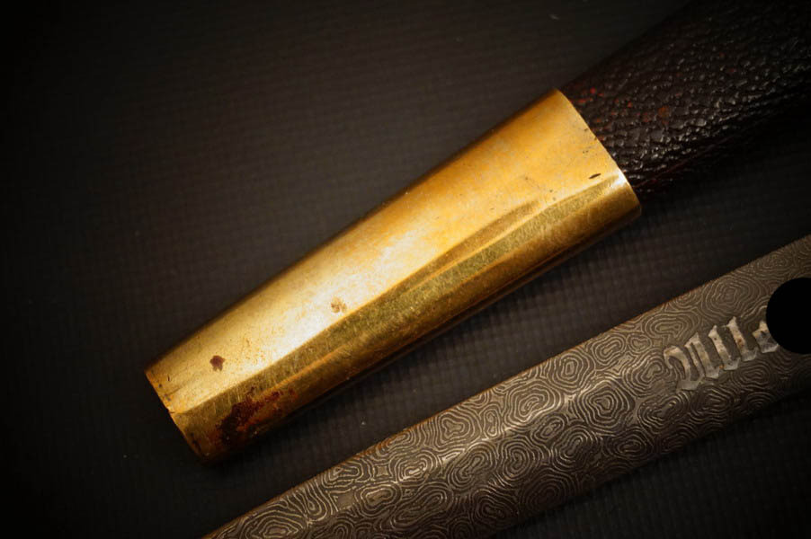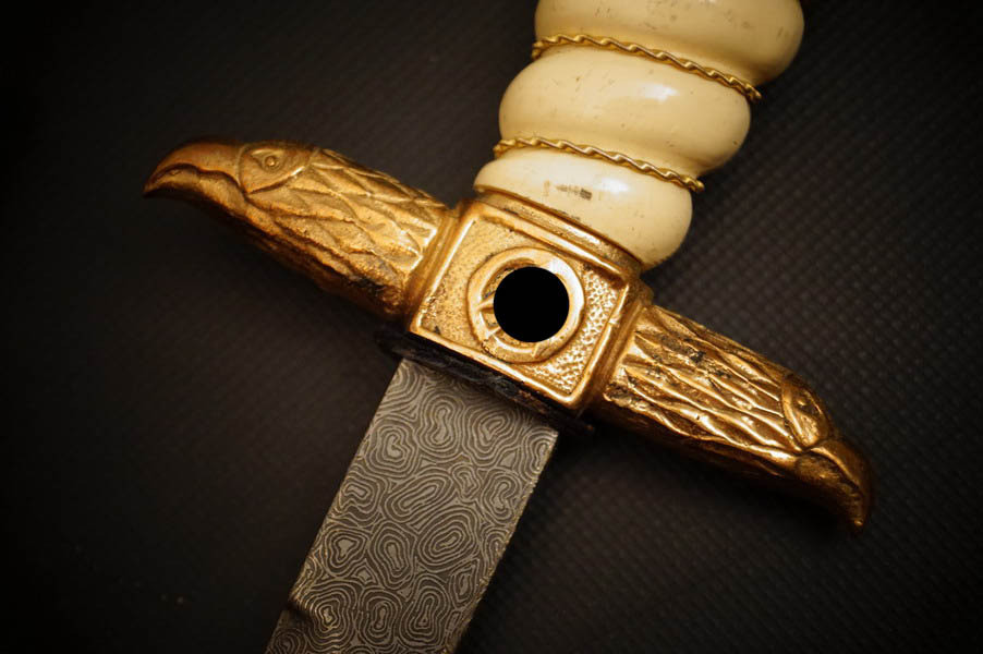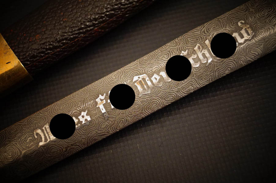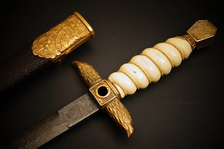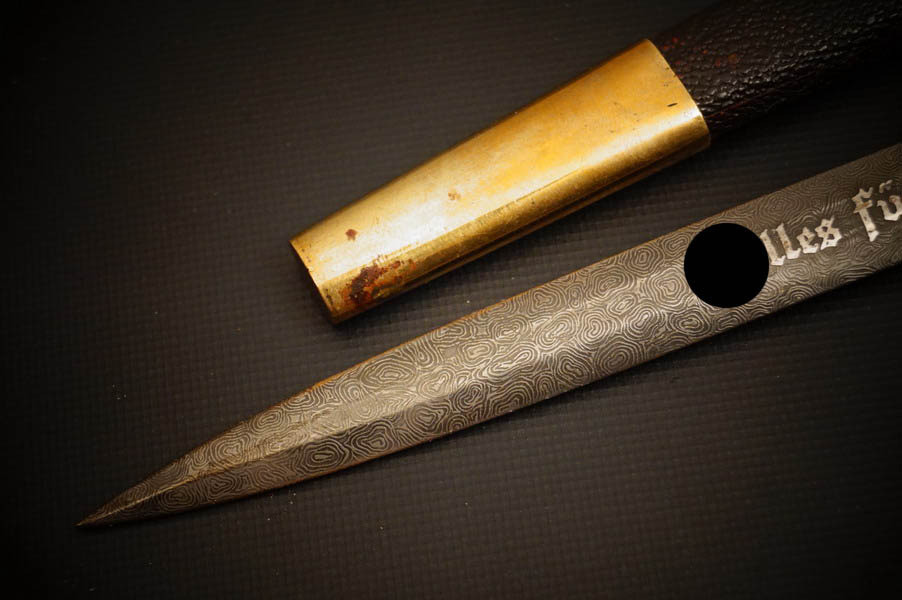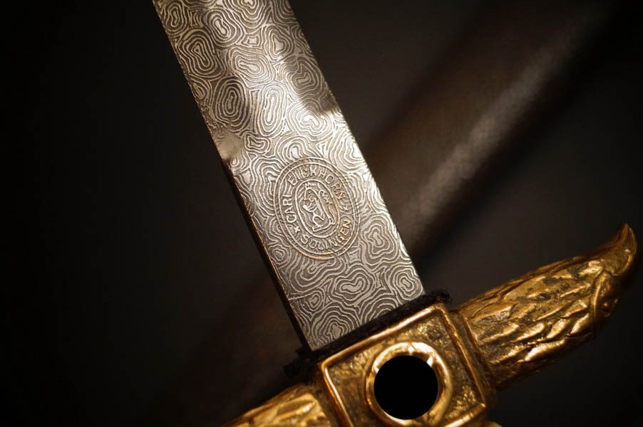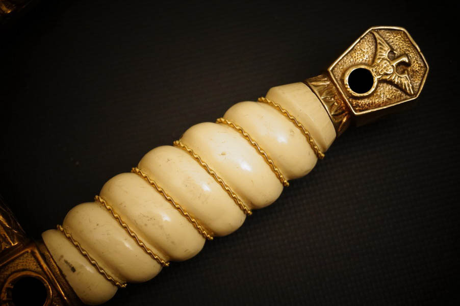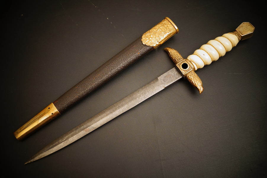 Fundzustand. Siehe Johnson Ref. Books Vol. VIII Seite 135. Stück wird sicher aus alten Teilen zusammen gesetzt sein. Scheide aus Stahl mit braunem Saffianleder bezogen. Knauf und Parierstange aus Bronze. Ca. 70 Jahre alt.