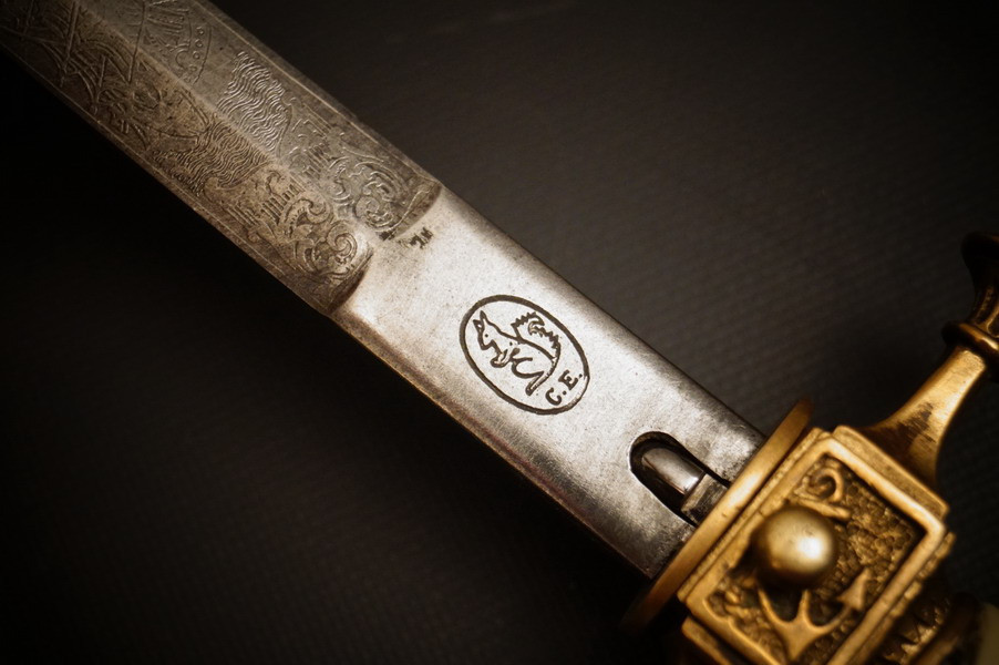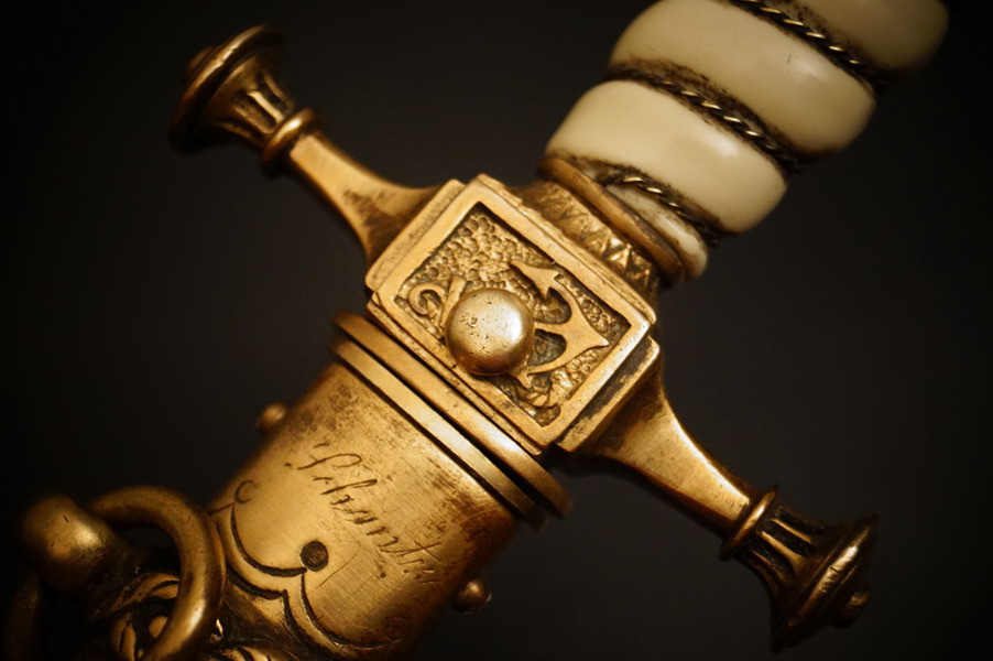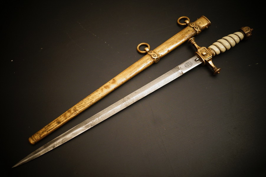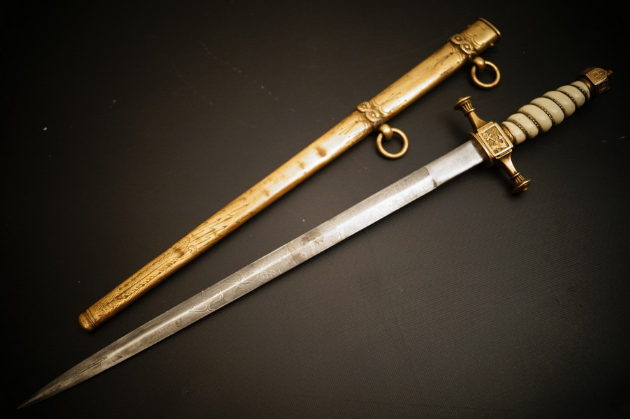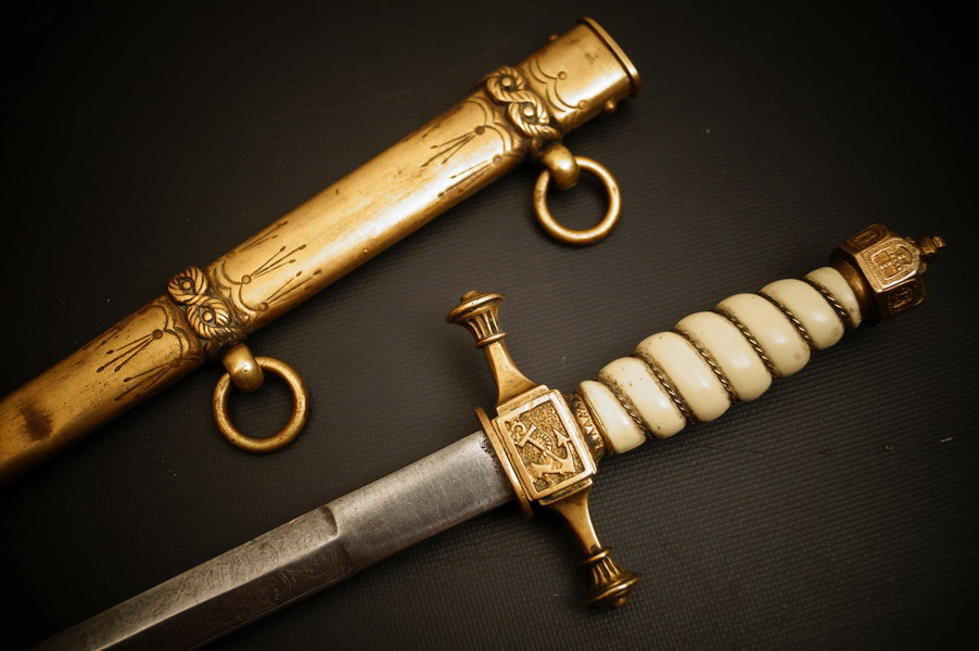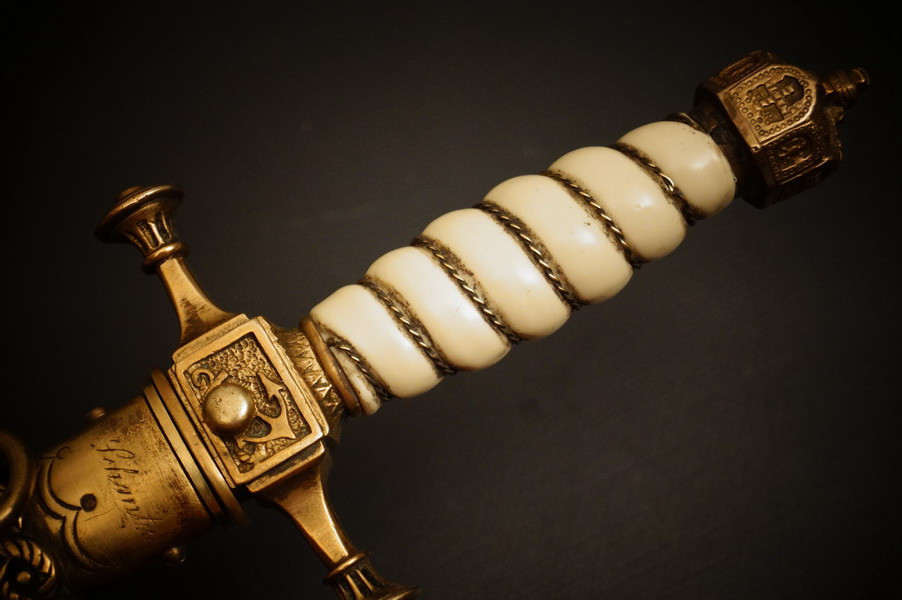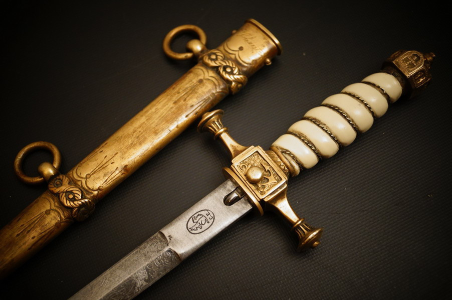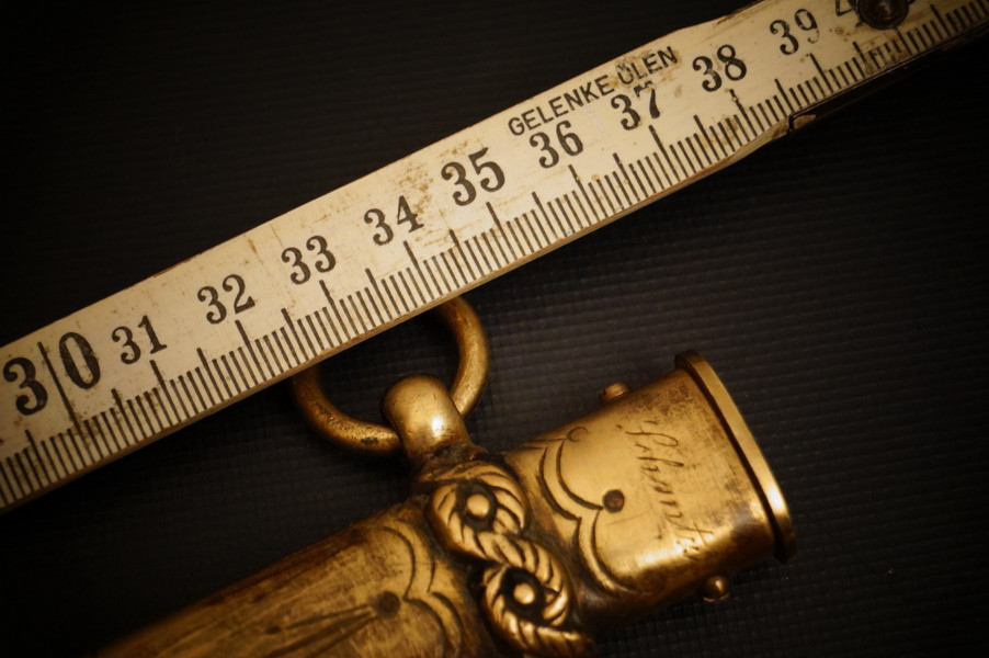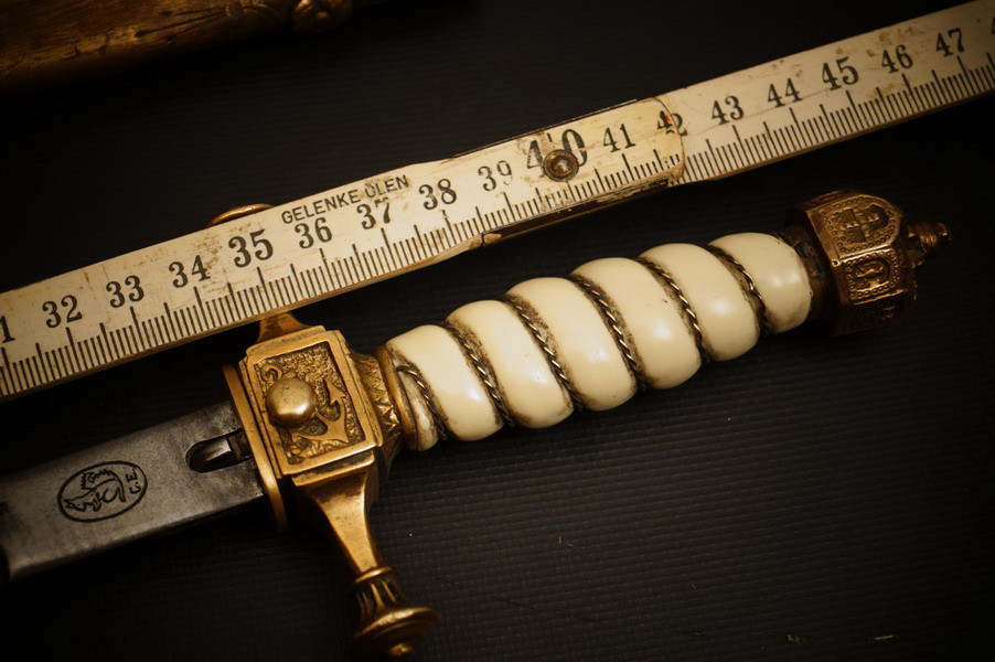 Fundzustand. Trägername auf der Scheide handgraviert, SCHANTZ - siehe Google nach dem Lebenslauf. Hermann Schantz - Seekadett in der Kaiserlichen Marine. War auf der Gneisenau, Wachoffz. Kanonenboot Panther, Torpedoboot G 112 …Torpedo Versuchs-Kommando usw.. Dolch ist sehr lang mit Hersteller und Ätzung. Bronzeteile. Scheide mit Holz innen und Drücker geht einwandfrei.