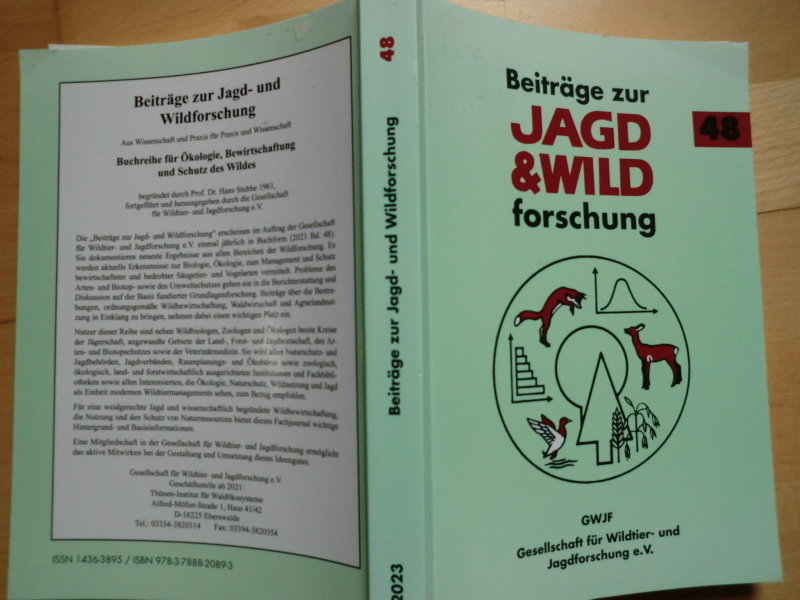 BEITRÄGE ZUR JAGD & WILD FORSCHUNG - Reproduktion, Lebenserwartung und Altersklassen von Wildtieren - herausgegeben von Prof. Michael Stubbe, Gesellschaft für Wildtier- und Jagdforschung, Halle 2023, 372 Seiten mit sehr vielen Abbildungen - Inhalt u.a.: Reproduktionsstrategien bei Säugetieren / Fortpflanzung und Lebenserwartung von Gämsen / Geschlechter- und Altersstruktur des Muffelwildes / Bejagung und Reproduktion des Rehwildes / Natürliche Ernährung von Rehen / Bewertung des Lebensraumes von Rot- und Rehwild / Der Braunbär / Aufnahme von Baumwurzeln durch Schwarzwild / Der Goldschakal in Ostfriesland / und vieles andere mehr - Guter bis sehr guter Zustand