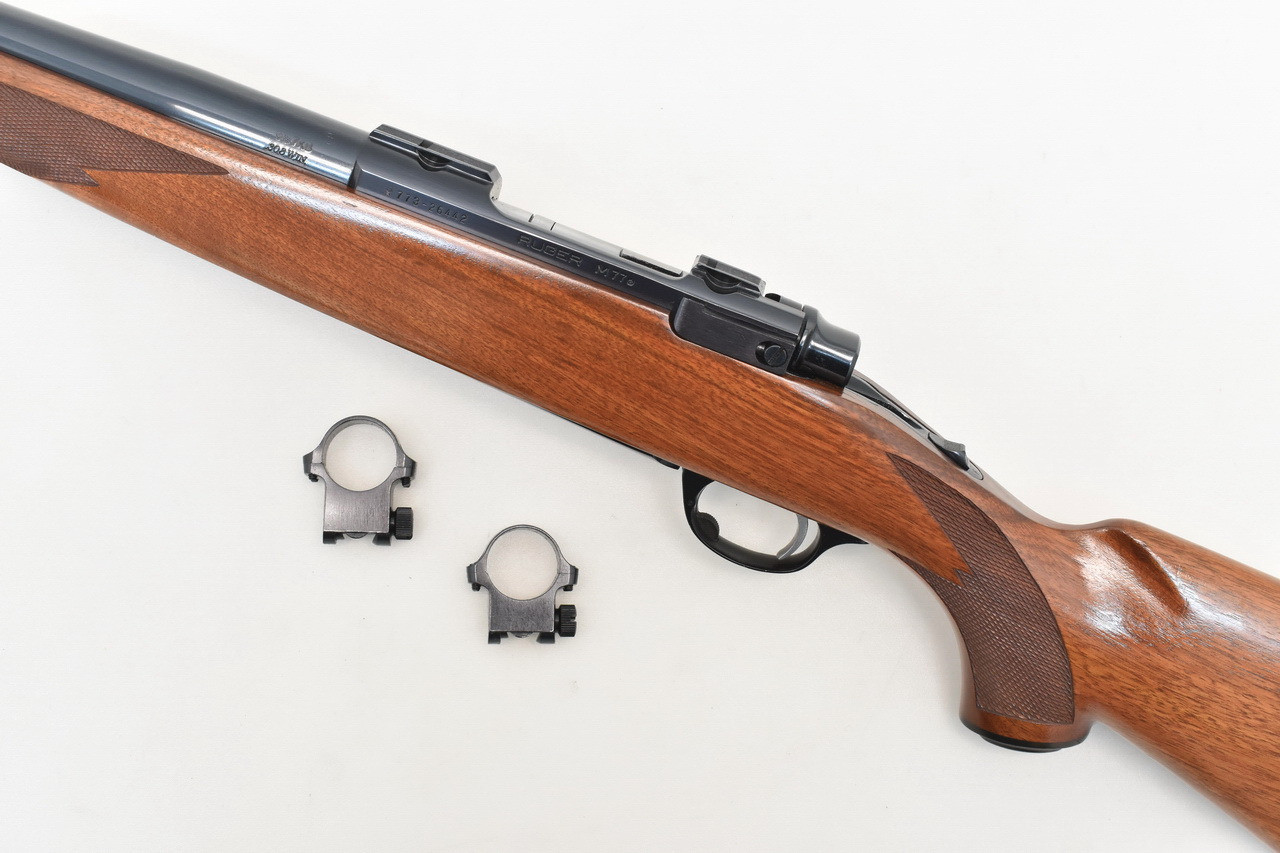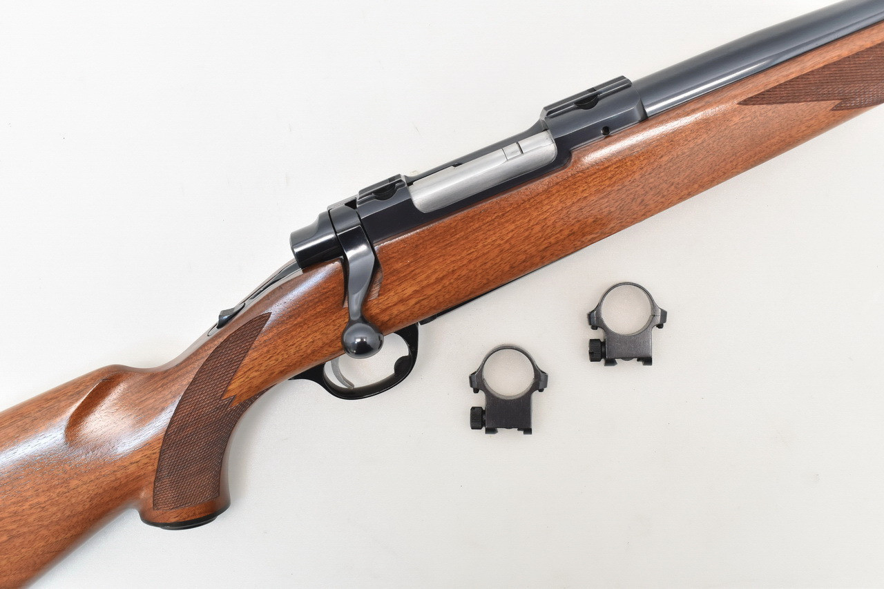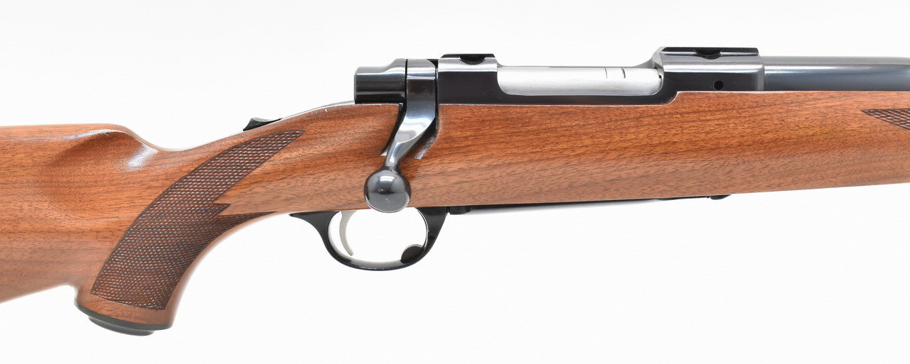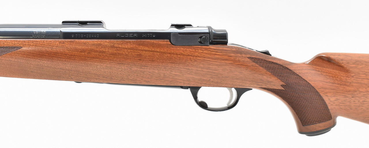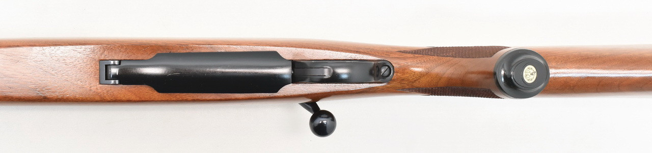 Bewährter Repetierer M77 VARMINT des amerikanischen Herstellers Sturm, Ruger & Company, Inc. Einstellbarer Direktabzug. Am Kolbenhals gelegene Schiebesicherung. Klappdeckelmagazinkasten. Spiegelblanker 24" Präzisionslauf mit 19mm Mündungsdurchmesser. Mellrichstädter Beschuß 1991. 343mm langer Schaft für Rechts- und Linksschützen ( Schaftlänge gemessen vom Abzug bis Mitte Gummischaftkappe ). Mit originaler RUGER Aufkippmontage für Zielfernrohre mit 25,4mm Mittelrohrdurchmesser. Die Waffe präsentiert sich im BESTZUSTAND. Details siehe Bilder.