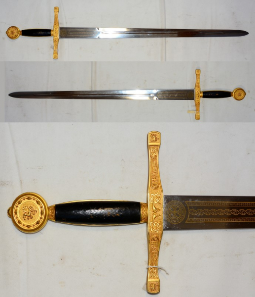 Replik des Kaliburschwerts von König Arthur, Klingenlänge 88cm, Gesamtlänge 113cm, Gewicht 2,2kg, Klinge an der Fehlschärfe verziert, im Knauf Drachenwappen, der Griff golden, ev. vergoldet, Lederbezug des Griffs mit Gebrauchsspuren ansonsten neuwertiger Zustand, der Hersteller ist nicht eingeschlagen und unbekannt, von der Größe praktisch ein Schwert zu eineinhalb Hand, ohne Scheide